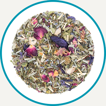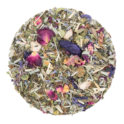 Ingredients: Rooibos, Spearmint, Lemongrass, Nettle, Lavender, Passion flower, Lemon verbena, Rose petals, Willow bark, Plum + Mallow petals