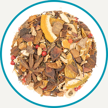 Ingredients: Ginger, Tulsi (Holy Basil), Cinnamon, Anise, Orange + Apple pieces, Star Anise, Pink peppercorns, Orange slices, Safflower petals, Natural flavours